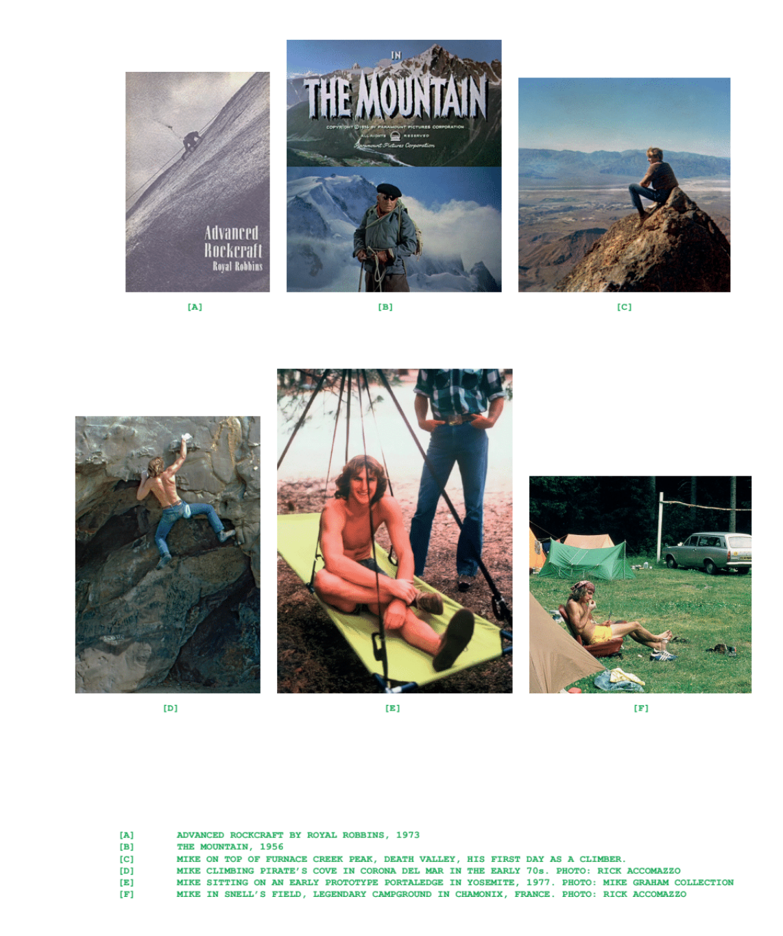 MIKE: I grew up close to the ocean on the US west coast, so I was surfing a lot as a kid, but I was into the outdoors generally speaking. Weirdly enough there was a ski shop in Newport Beach, even though we were miles from snow. That was the local go-to place for these kinds of sports, and they had a little tiny section of climbing equipment. I remember finding all the gear fascinating, and I had just seen a famous movie called ‘The Mountain’ with Robert Wagner and Spencer Tracy. It showed them climbing in an interesting way, and I was drawn to that and all the gear they used, like pitons and carabiners. At the same time, I started reading books like ‘The Art of Mountaineering’ and ‘The Art of Rock Climbing’ by Royal Robbins, which was probably the first kind of seminal publication on true rock climbing.