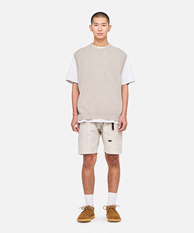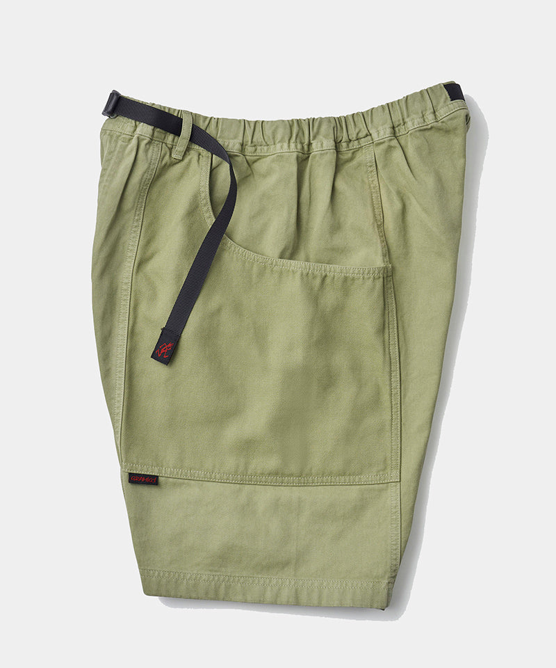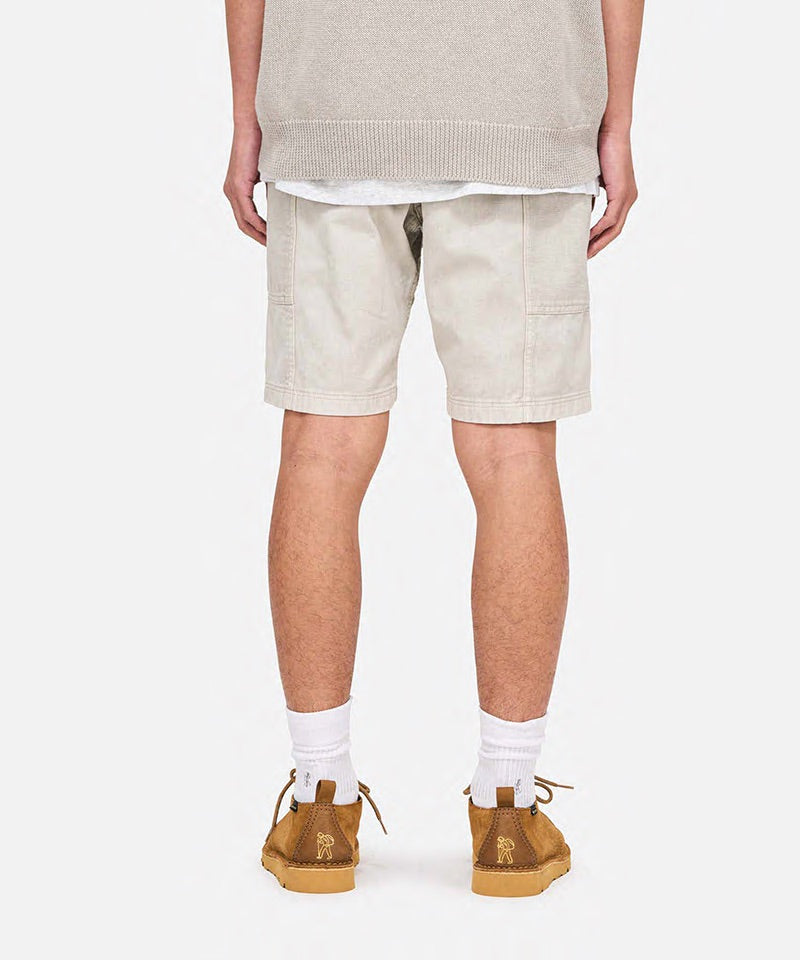 These shorts are able to hold gadgets to suit modern lifestyles, while maintaining the functionality during climbing that serves as the brand's roots. Highlighted by large pockets extending from the front to the back, the silhouette combines a comfortable looseness with a smart appearance. Tough canvas is used for these pockets, while the contrast between the two types of materials through garment dyeing is another notable feature. Also, the D-ring with the brand logo on the right side is useful in the outdoors and in the city, as it can hold keys and bottles. They are made of 100% organic cotton twill with high durability, tension, and stiffness that can even withstand strenuous movement and dyed to give character to their appearance.