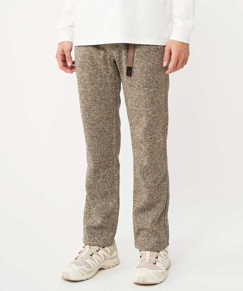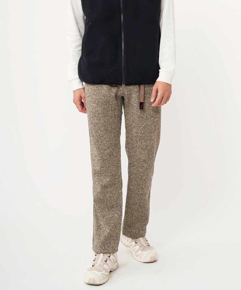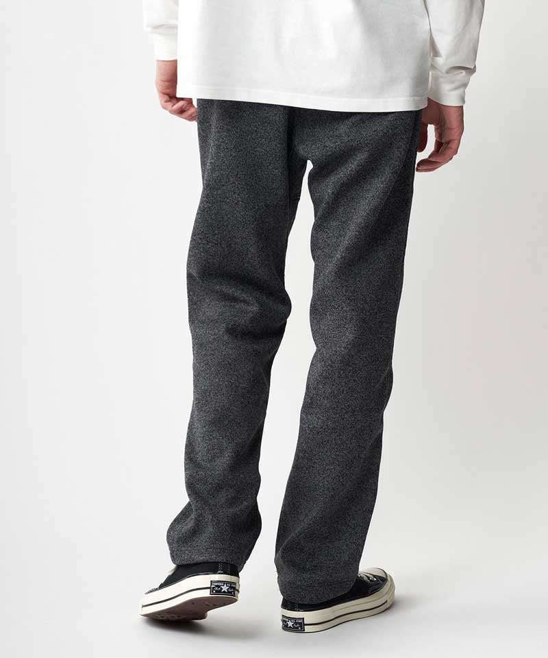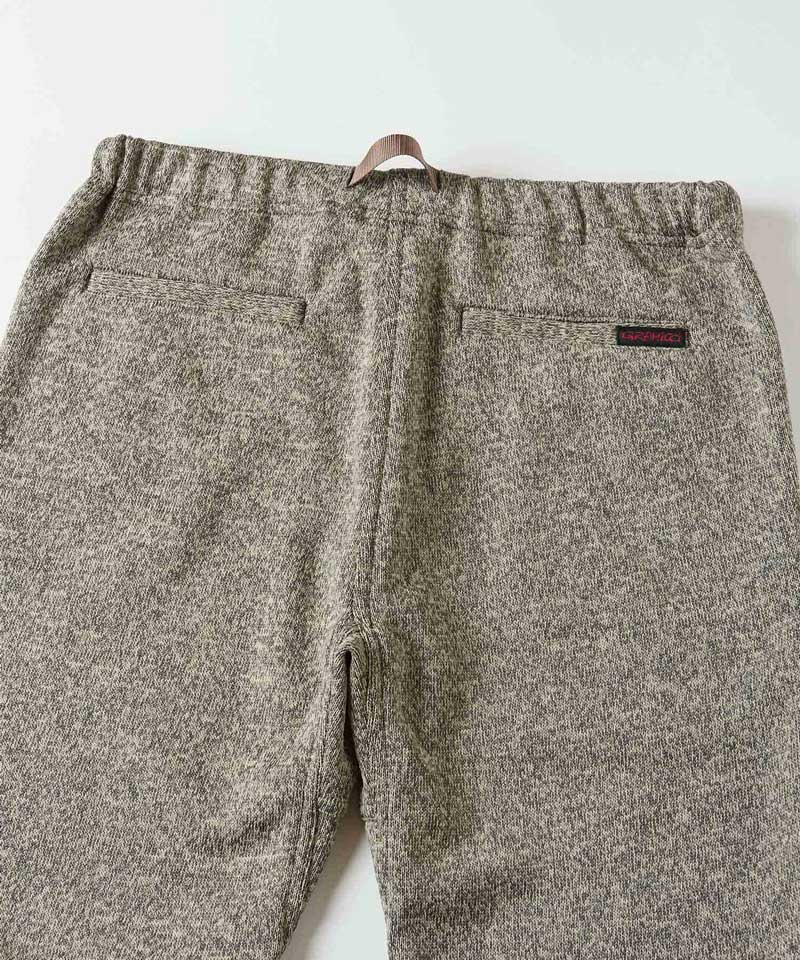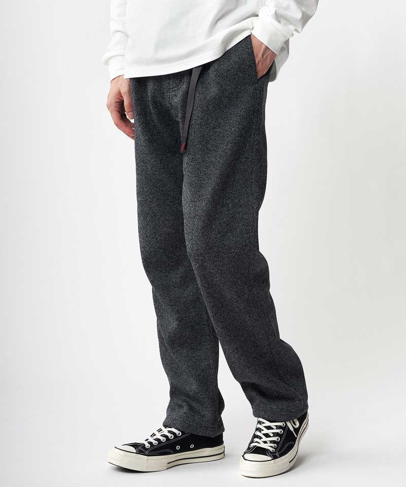 The classic Gramicci Bonding Knit Fleece NN Pant features a slim silhouette that is tailored to modern lifestyles while retaining functionality in the brand's climbing scene roots. These outdoor lifestyle pants have a tapered silhouette that narrows toward the hem, but they are made from stretch material, so they can also be used as activewear. Compared to NN-Pant, these NN-Pant Cropped Pants are 4 cm shorter and are designed to show the ankles without rolling up the hems. Made with Gramicci's fall and winter signature material, the knit fleece's surface looks knitted. The pants are stretchy and can be worn without stress. Microfleece is affixed to the inside to maximize heat retention and keep the wind out.